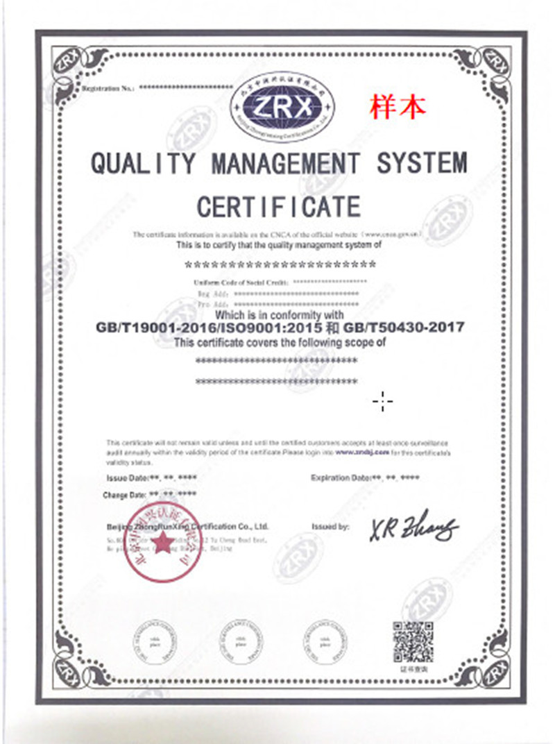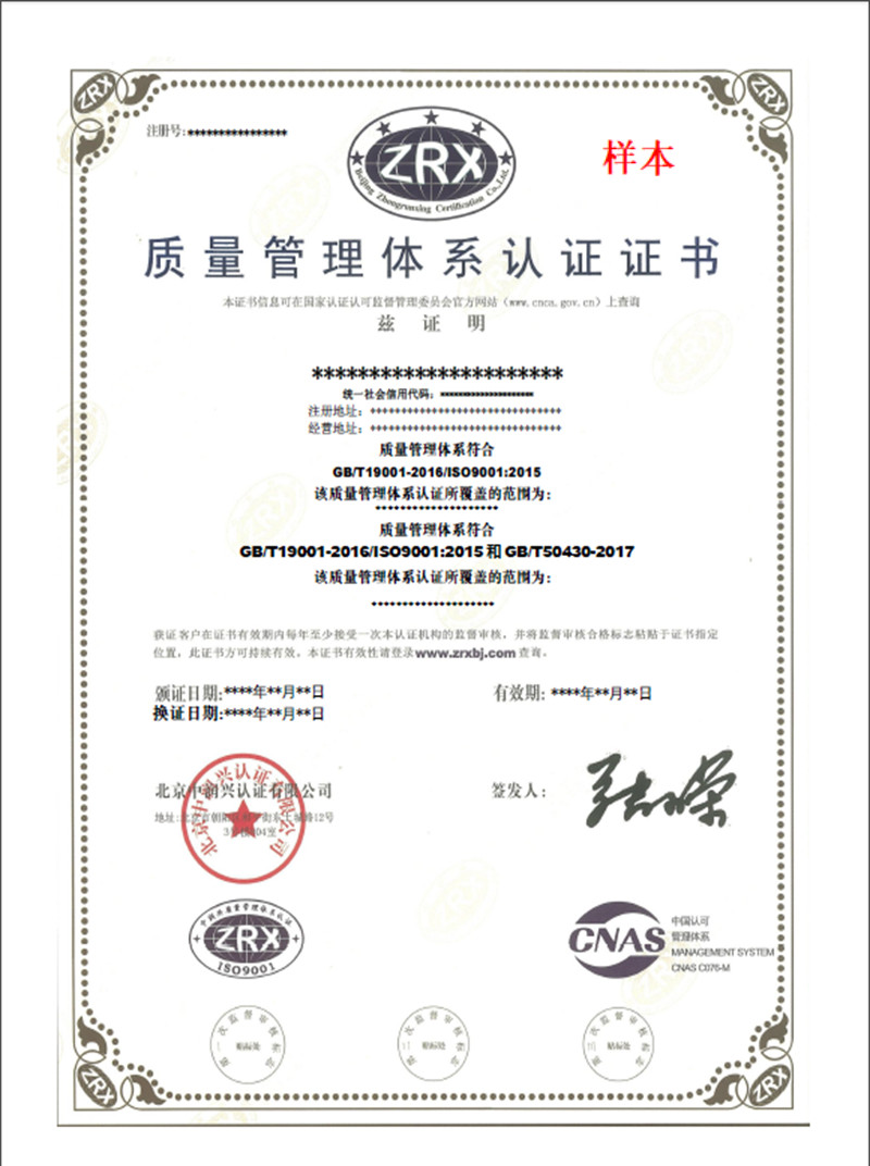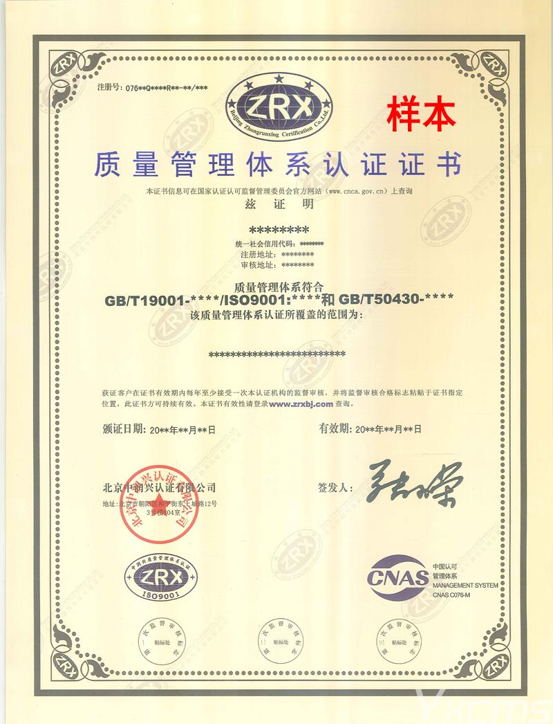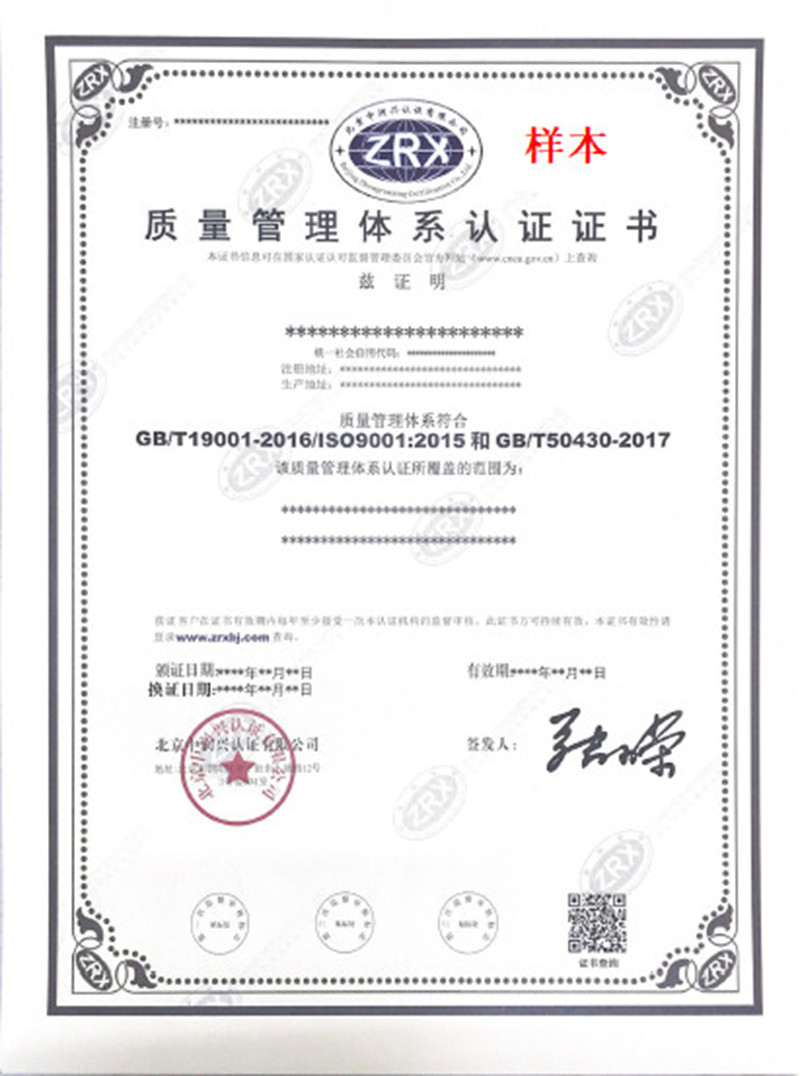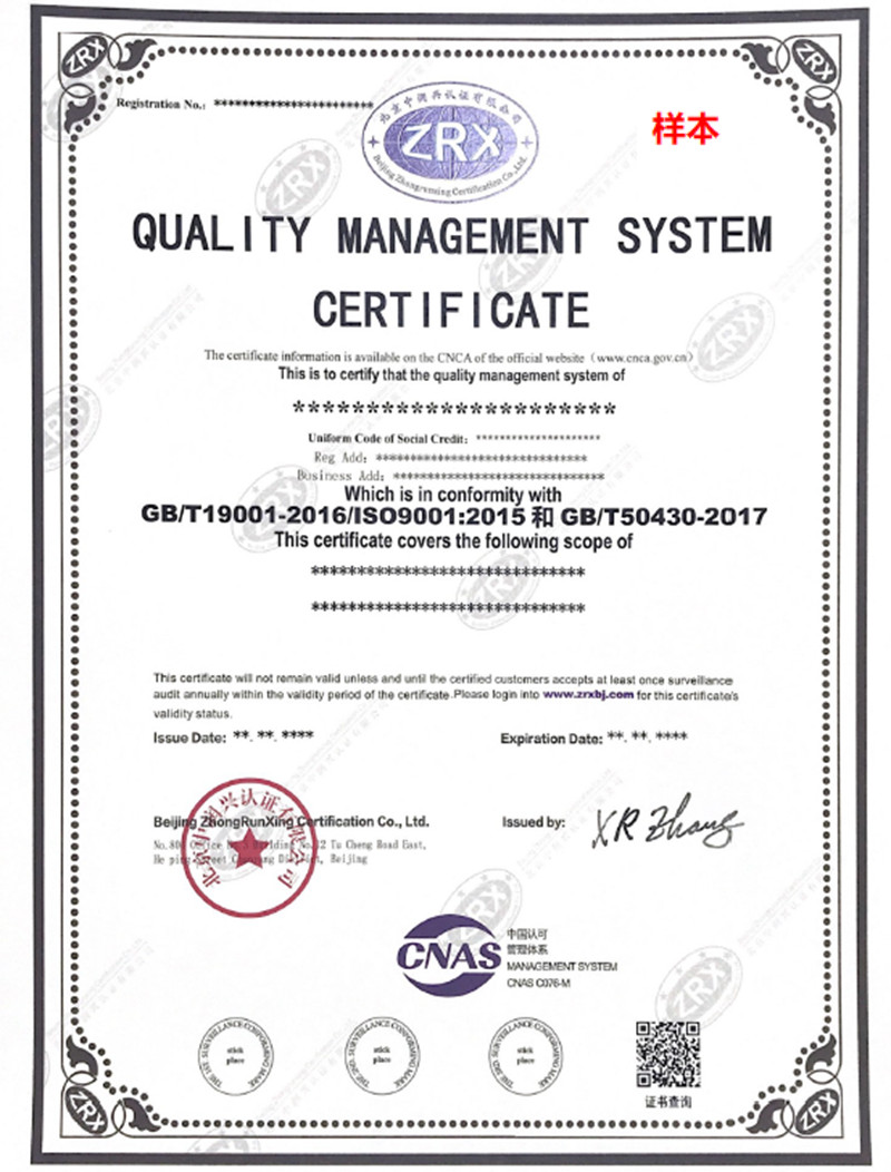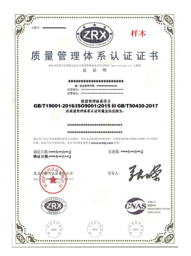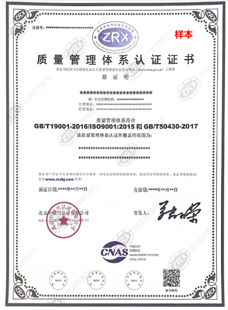 質(zhì)量管理體系認(rèn)證證書(shū)樣本